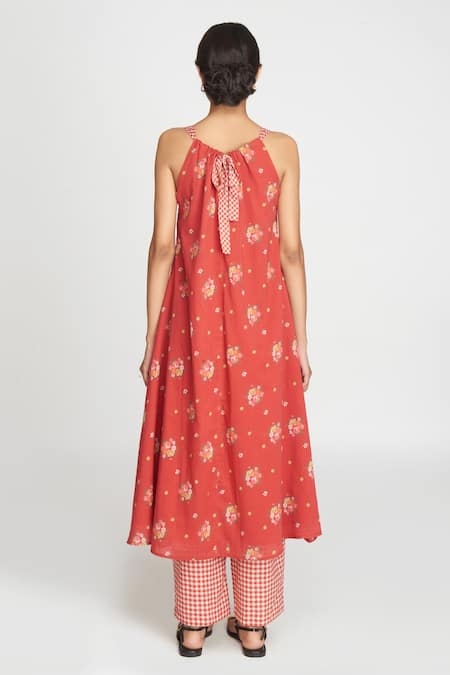 Red floral printed kurta featuring a sleeveless design and a flowy silhouette. Paired with checkered pants made from cotton.