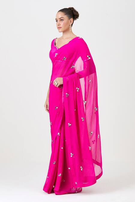 Neon pink saree featuring scattered abstract mukaish embroidered buttis. Paired with a blouse adorned with mukaish work panels.