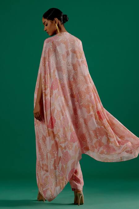 Blush pink kaftan featuring foliage print with embroidered pearl and sequin work bodice. Paired with matching pants for a cohesive look.