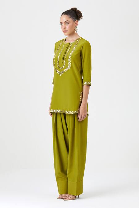 Green Crepe, Silk, Chiffon Embroidery, Mirrors Round Mehek Kurta Salwar Set