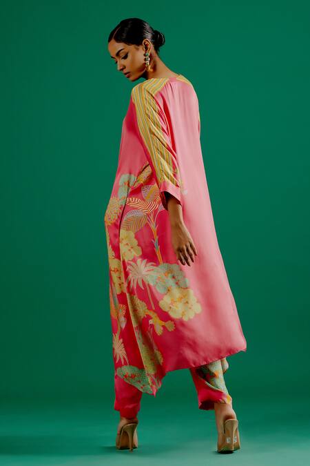 Fuchsia kurta featuring a garden print and handkerchief hemline. Paired with matching pants for a complete look.