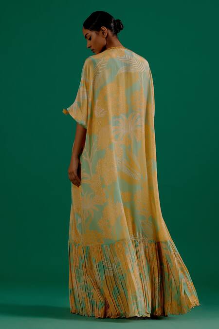 Aqua green and yellow cape featuring foliage print and floral sequin embroidered border. Paired with a scallop print blouse and matching sharara.