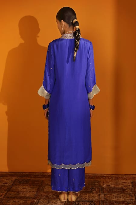 Royal blue straight kurta featuring nakshi embroidery in gold and silver. Paired with matching pant and a contrasting semi-sheer dupatta with scalloped hem.