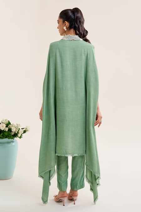 Green asymmetric shirt featuring a sequin embroidered collar and pearl detailing. Paired with coordinating pants in cotton slub fabric.