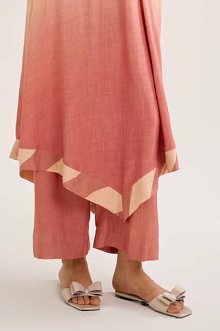 Salmon ombre kurta with flared sleeves and sequin embroidered neckline. Paired with a coordinating pant featuring an elasticated waistband.