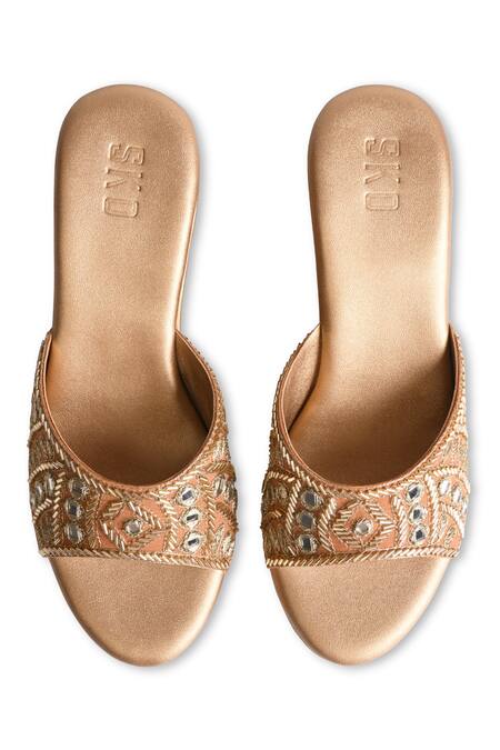 Gold wedges crafted in vegan leather featuring embroidered straps with mirror and cutdana accents