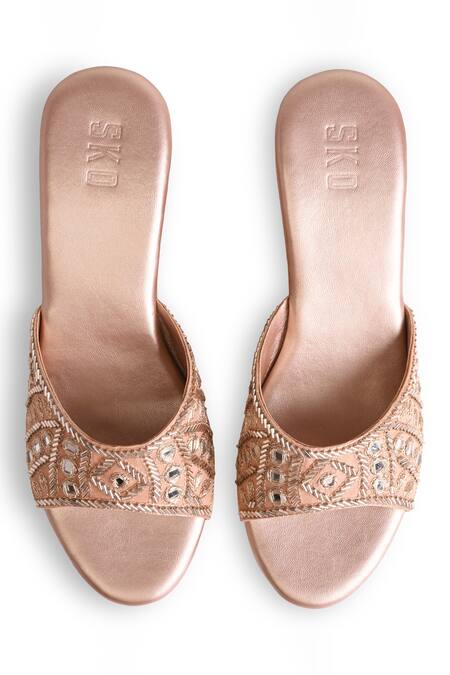 Mirror and cutdana embroidery on straps, Padded insole for comfort, Elegant rose gold color