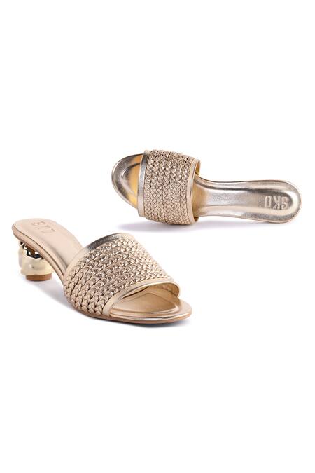 Gold vegan leather mule heels featuring broad braided straps