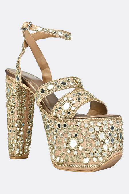 Gold platform heels featuring intricate kasab embroidery and mirrorwork