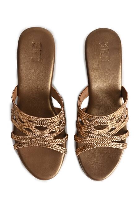 Brown vegan leather wedges featuring cut-out straps adorned with crystals