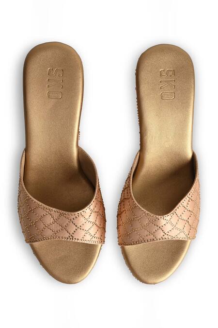 Gold wedges featuring a crystal embellished strap and slip-on design