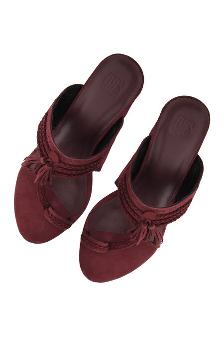 Maroon kolhapuri block heels featuring braided straps and tassel embellishments