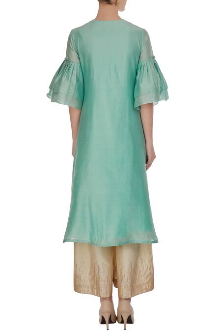 New-age, quirky, and very offbeat for a sangeet event, this sky blue chanderi kurta features flared ruffle sleeves and shimmery embroidery here and there. It comes along with embroidered palazzo pants for the full indian look. Just team up gold stilettos and jhumka earrings for a great look.