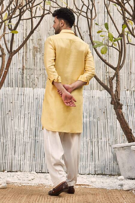 Pastel yellow bundi jacket featuring hand embroidered welt pockets and front buttons. Paired with a straight kurta and cotton satin salwar.