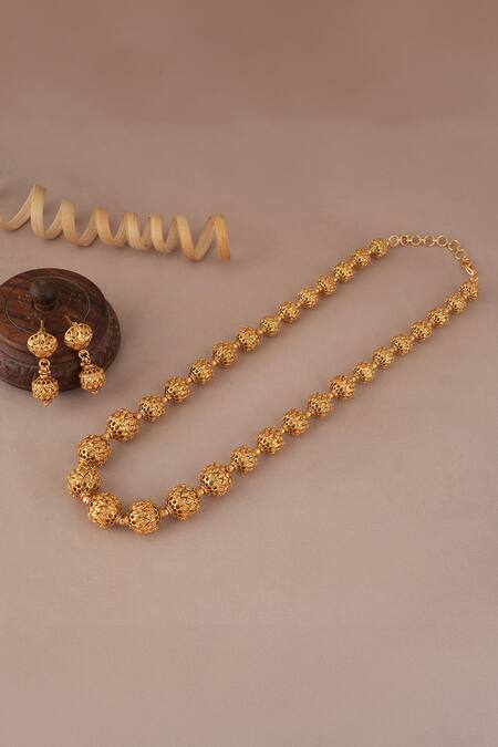 Antique gold mala set featuring intricately designed beads and matching earrings. The earrings showcase a similar detailed design with a hanging element.