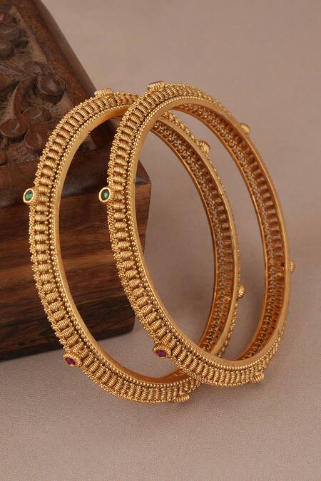 Antique gold bangle set featuring intricate stone embellishments. Includes three bangles with decorative detailing and colored stones.