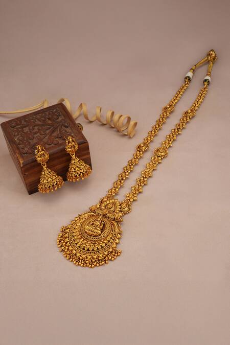 Buy_Smars Jewelry_Gold Plated Goddess Laxmi Carved Pendant Necklace Set_at_Aza_Fashions