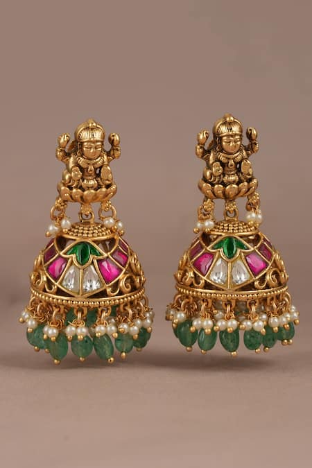 Gold designer earrings featuring synthetic stone work and intricate detailing
