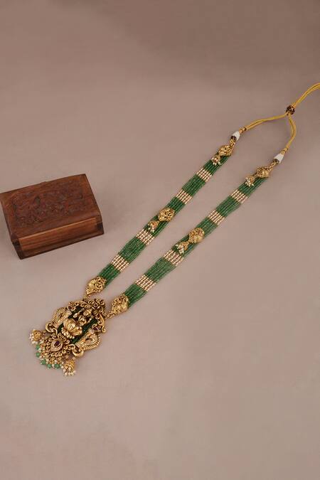 Intricate central pendant design, Synthetic stone accents, Drawstring closure for adjustable fit