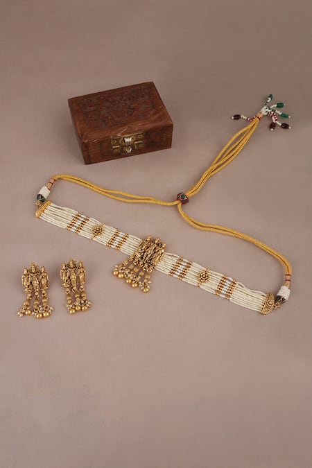 Drawstring closure for adjustable fit, Intricate pearl work on necklace and earrings, Gold plating with lead and nickel-free composition