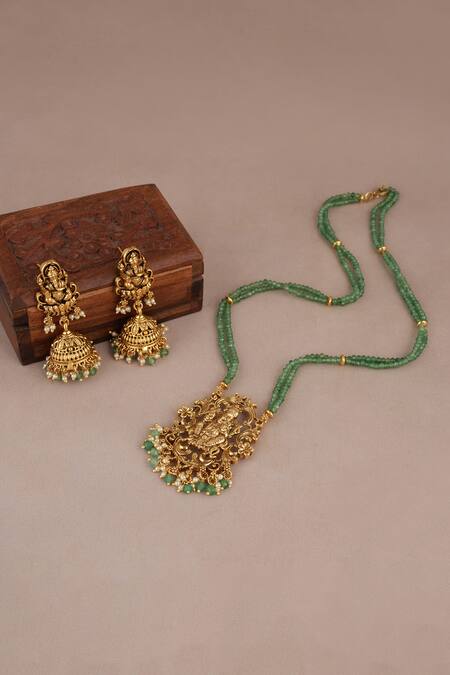 Intricate central pendant depicting a deity, Pearl accents on the necklace and earrings, Lightweight design for comfortable wear