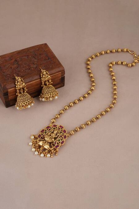 Deity motif pendant with pearl drops, Intricate detailing on earrings, 1 Micron Gold plating for durability