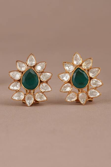 Gold designer earrings featuring Kundan work with a central green stone and surrounding clear stones