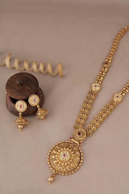 Intricate gold detailing on necklace, Ruby and Kundan embellishments, Jhumka earrings with detailed craftsmanship