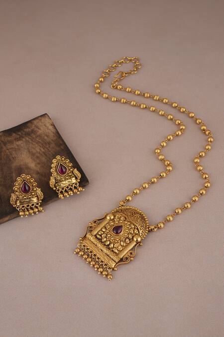 1 micron gold plated, antique gold finish necklace with ruby stone embellished, carved pendant drop. Comes with matching pair of earrings.