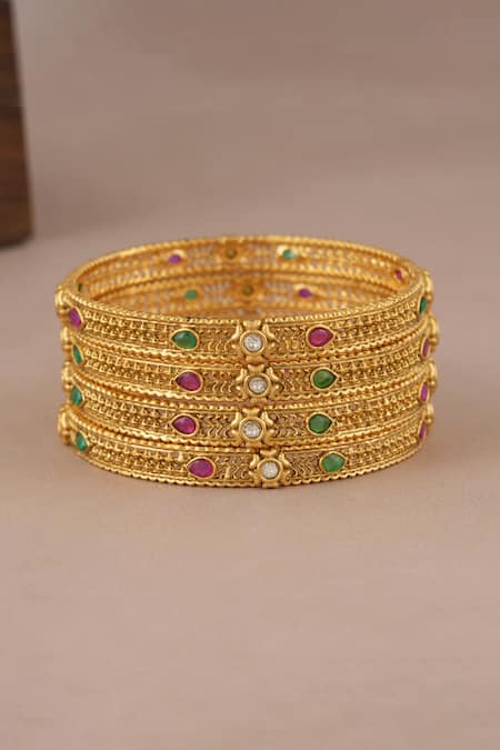Buy_SMARS JEWELRY_Gold Plated Stones, Crystals Studded Jaali Bangles-Set of 4_at_Aza_Fashions