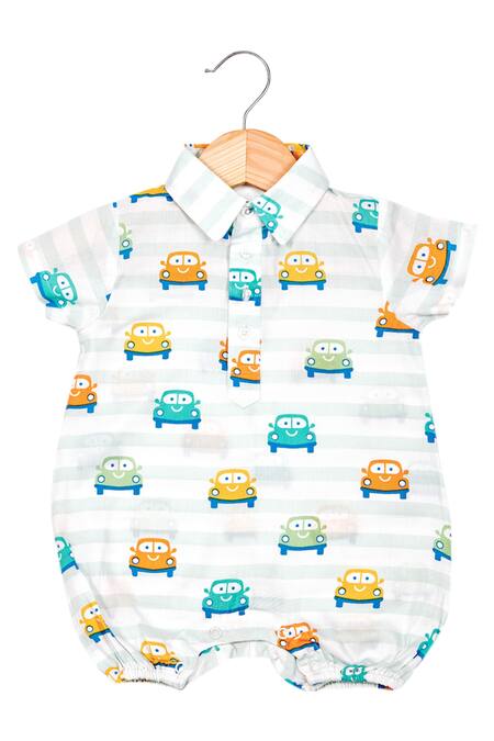 Shirt Collar , Cap Sleeves , Buttoned Placket , Crotch Snap Button , All Over Car Print
