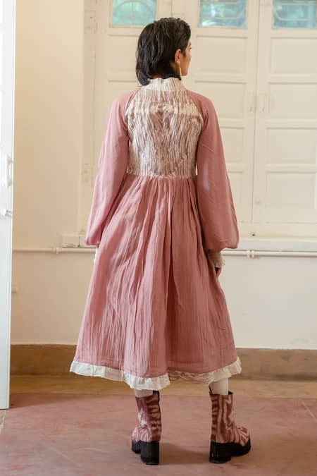 Pink Chanderi Organza Silk High Neck Smocked Dress