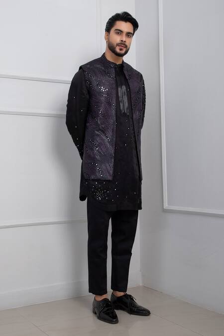 Black Nehru jacket with abstract wave pattern and mirror embroidery. Paired with a mirror embroidered kurta and coordinating pant.
