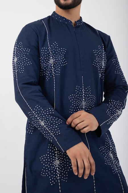 Blue kurta featuring hand embroidery with beads and thread work. Paired with plain contrasting straight pant.