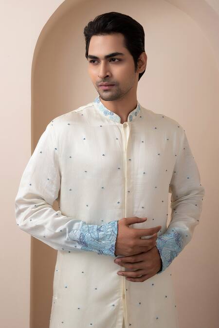 White kurta featuring floral bead embroidery at the collar and cuffs. Paired with coordinating cotton pants for a complete look.
