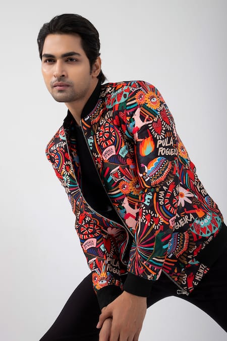 Multi color bomber jacket featuring abstract print with placement sequins embroidery