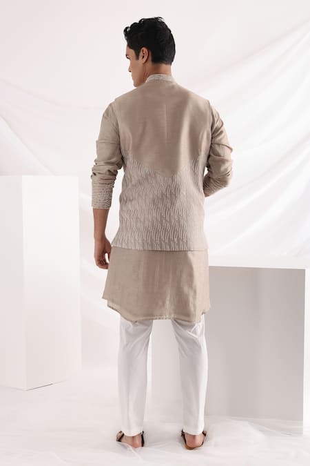 Beige bam silk bundi featuring ivory leaf pattern thread and beads embellishment