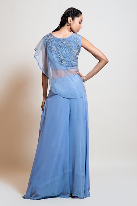 Light blue organza sheer cape with attached crepe inner top, embellished yoke with silver cut dana & pearl work. Paired with georgette flared palazzo.