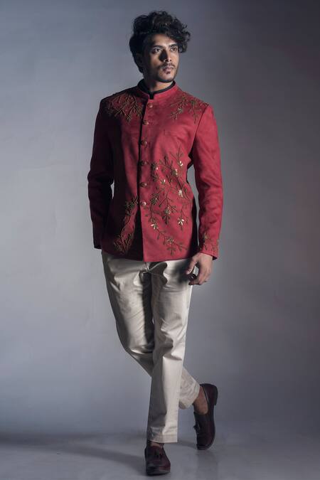 Red bandhgala with embroidered floral motifs. Comes with pant.