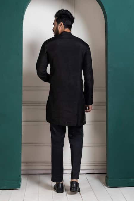 Black embroidered kurta featuring a high neckline and intricate detailing. Paired with matching black pants in malai cotton.