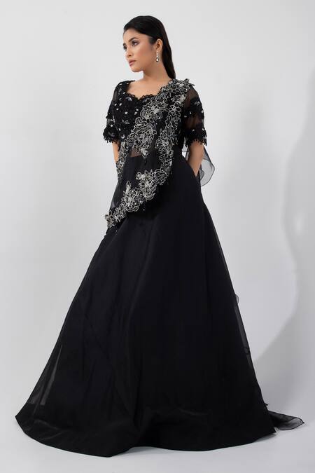 Black lehenga set featuring a ruffle one shoulder draped cape with thread embroidered floral jaal motifs. Accompanied by a padded embellished blouse and can can attached lehenga.