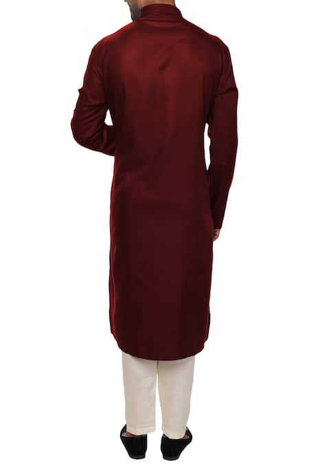 Maroon straight kurta with floral work near the placket. Comes with off white straight pant.