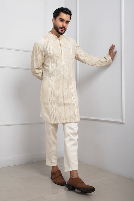 Ivory Chanderi, Cotton, Linen, Satin Embroidery, Beads Nehru Jacket And Kurta Set