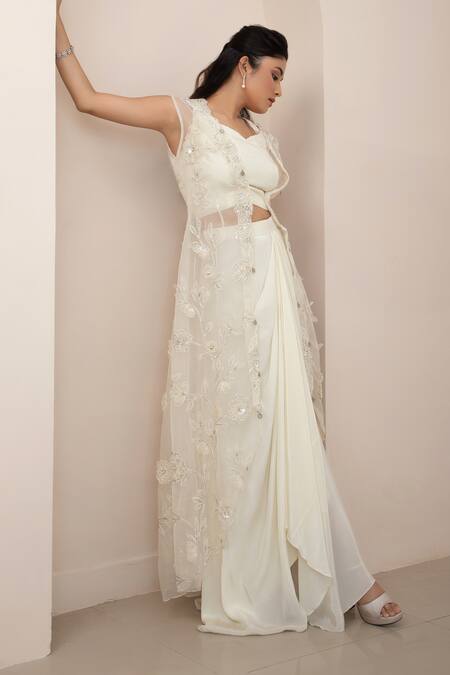 White Modal, Organza Sequins, Beads, Floral Sheer Jacket Draped Skirt Set