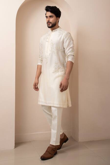 Ivory kurta featuring floral embroidery in gold thread and beads. Paired with coordinating ivory pant.