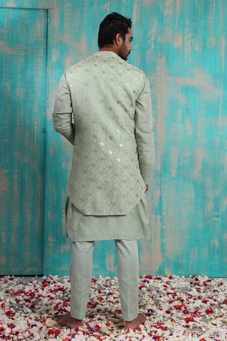 Pista green front open bundi with sequin work in geometric motifs. Paired with silk kurta & pant.