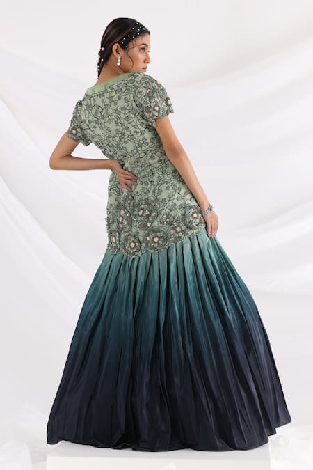 Green floral embroidered lehenga set featuring a cowl draped blouse and an open jacket. The lehenga showcases ombre detailing and is paired with a sleeveless blouse and a short-sleeved jacket.