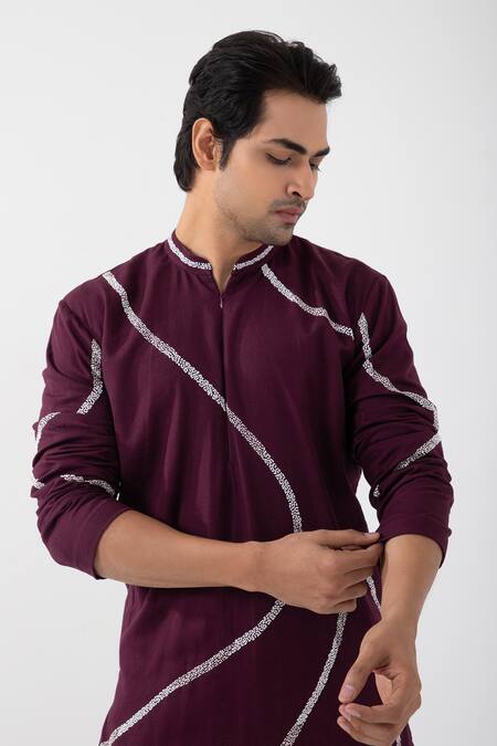 Maroon kurta featuring hand embroidery with beads and thread work. Paired with a plain straight pant and embroidered Nehru jacket.