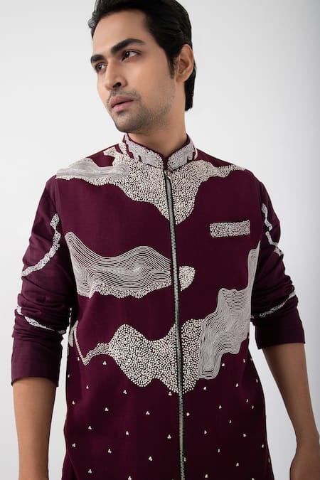 Maroon Nehru jacket featuring hand embroidery with thread work and beads