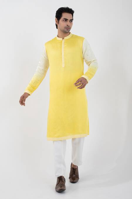 Yellow kurta featuring sequins embroidery on the sleeves and ombre shading. Paired with a contrasting straight pant and an ombre nehru jacket adorned with animal motifs embroidery.